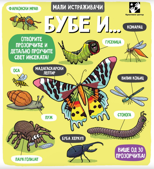 Pozivaju se svi mali istraživači! Pogledajmo bolje neka od najživahnijih, najjezivijih i najlepših stvorenja u prirodi. Otvorite prozorčiće da biste otkrili brojne zanimljivosti o životu insekata i drugih sitnih životinja koje gmižu, lete i mile oko nas.