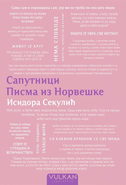 Pored toga što je živela u godinama burnih istorijskih dešavanja, ni tadašnja književna kritika nije bila spremna za književnost žene koja je kroz život išla sama i sa idejama budućeg vremena. Ipak, sve to nije predodredilo ni njen životni ni stvaralački put. Stekla je široko obrazovanje, bila je poliglota, interesovala se za druge kulture, te je mnogo putovala. Uz sve to, čitanje je za nju predstavljalo nepresušno izvorište nadahnuća i spoznaje sveta. „Saputnici“ su prvi put ugledali svetlost dana 1913. godine, a „Pisma iz Norveške“ 1914. godine. Dakle, ove i naredne godine obeležava se 110 godina od njihovog objavljivanja, a mi ih i danas čitamo i nalazimo u njima mnogo toga što prepoznajemo kao naše, odnosno savremeno. To potvrđuje da je Isidora Sekulić u svojim delima iznedrila ono što bismo mogli odrediti kao univerzalno u sveopštem ljudskom iskustvu. Ovo izdanje je dragoceno i po tome što je predgovor napisao profesor Jovan Delić.