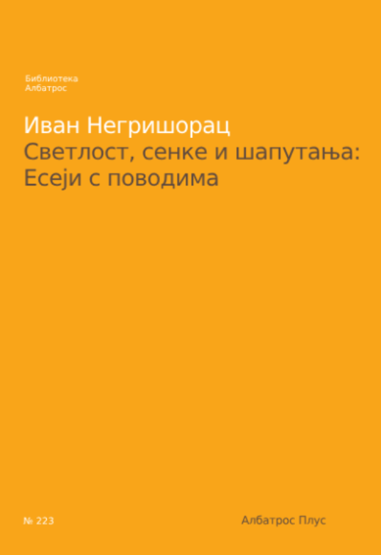 Knjiga Ivana Negrišorca Svetlost, senke i šaputanja: Eseji s povodima pisana je u dugom vremenskom rasponu od nekoliko decenija, ali glavnina tekstova nastala je od kraja 80-ih godina do danas. U raznim prilikama i s raznim povodima, autor je nastojao da opiše neke suštinske osobenosti srpske kulture, njene dubinske korene i savremene pojavne oblike, ali je isto tako želeo i da sagleda zlokobne oblike savremenog otuđenja od sopstvene kulture. U uslovima multikulturalizma i nametljive prevodilačke radionice, u vremenu razvijenih medija, pogotovo televizije, interneta i svih elektronskih čarolija, često ćemo se suočavati s činjenicom da je među nama sve više onih koji na našu vlastitu kulturu gledaju tuđim očima. Sami sebi postajemo stranci onda kada ne znamo ko smo i šta smo, kakve vrednosti smo u prošlosti negovali i kakve vrednosti u sadašnjosti i budućnosti treba da gradimo.