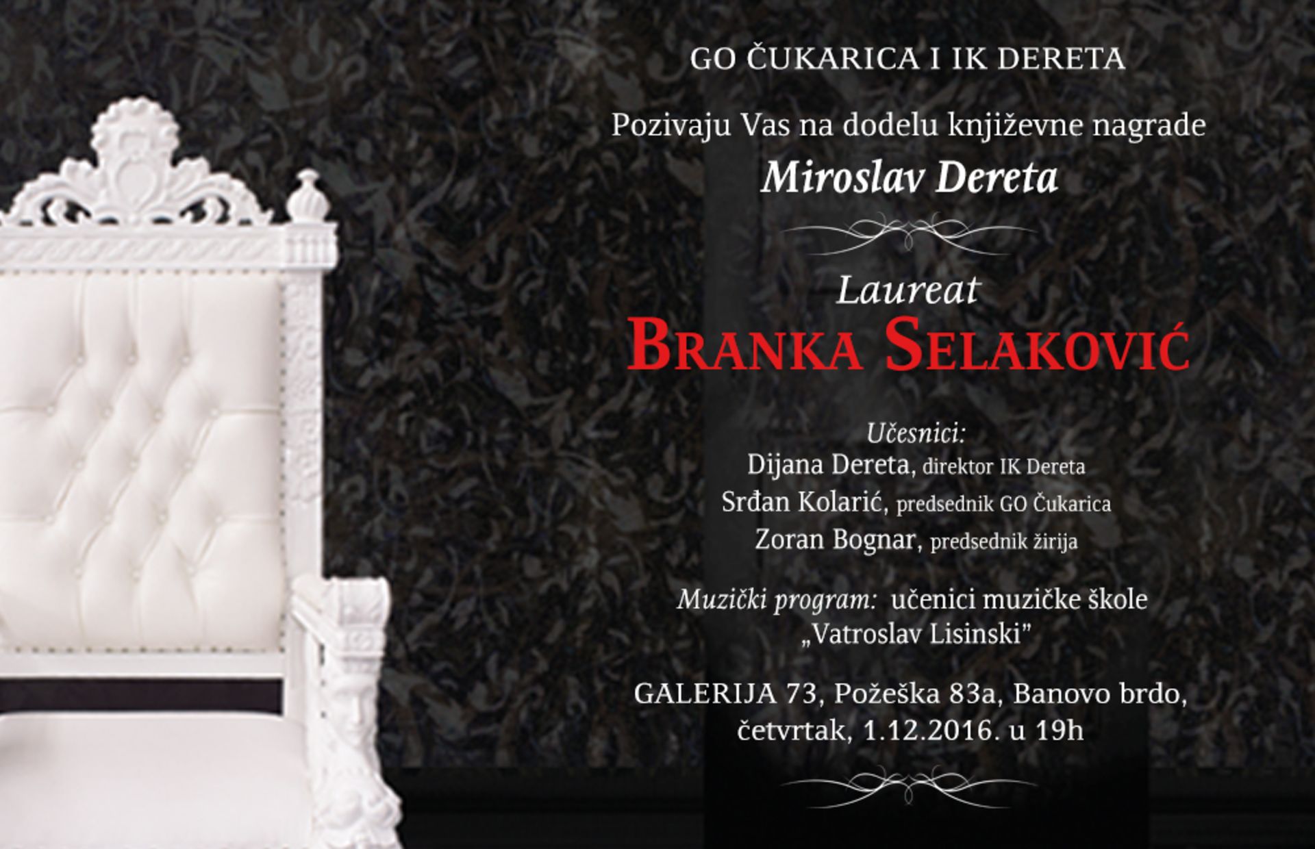 Nagradu će uručiti Srđan Kolarić, predsednik GO Čukarica i Dijana Dereta, direktor Derete, a o knjizi će govoriti predsednik žirija Zoran Bognar i Branka Selaković.