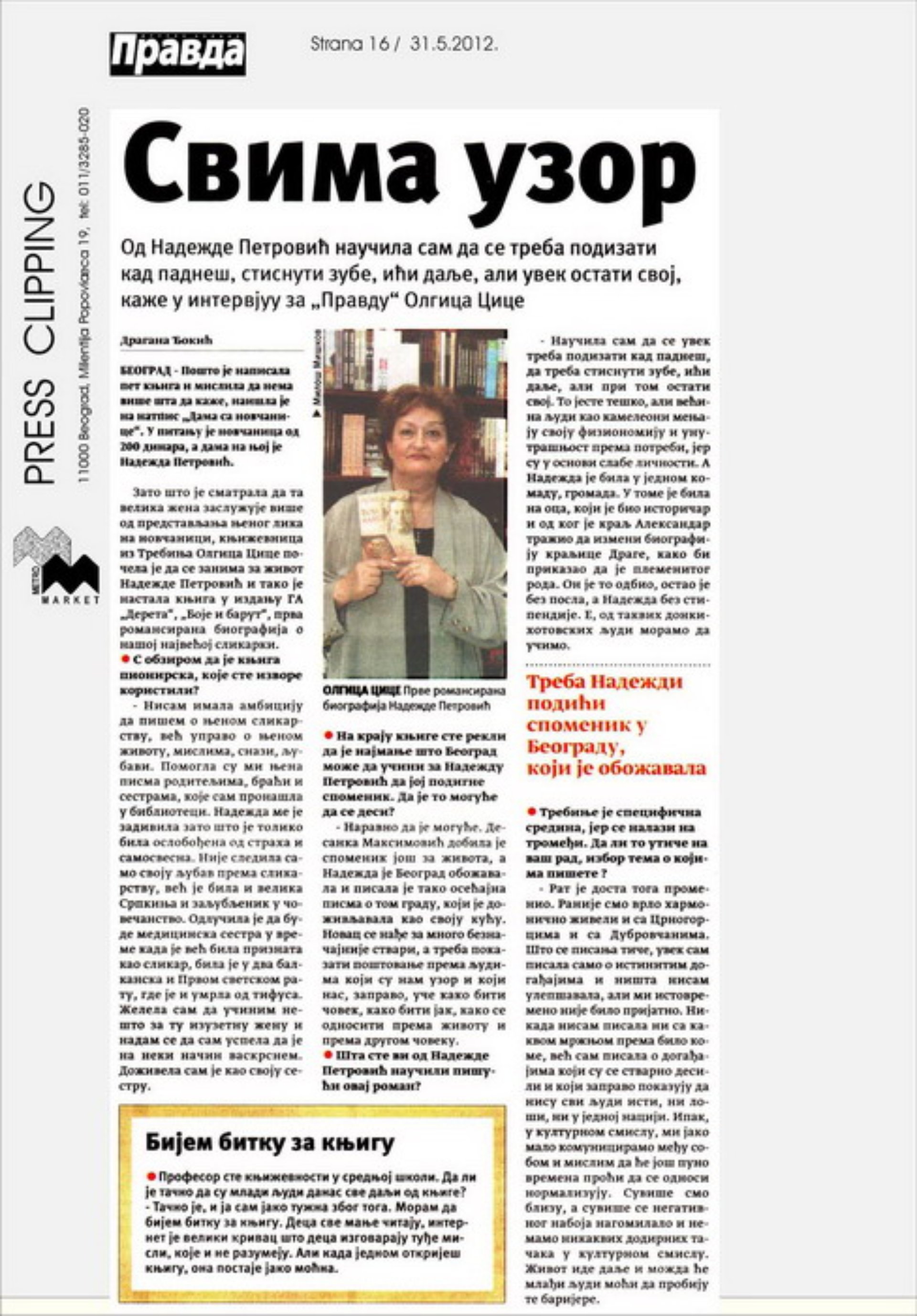 Nadežda Petrović svakako je bila jedna od onih srpskih slikarki i intelektualki koje su kroz svoje delo razgrtale istorijske naslage naše kulture i civilizacije. Književnost naknadnim rekreiranjem takvih veličina crpi novu snagu za afirmaciju ideja koje ne gube vrednost ma kako davno bile začete….. (Dereta online/Pravda)