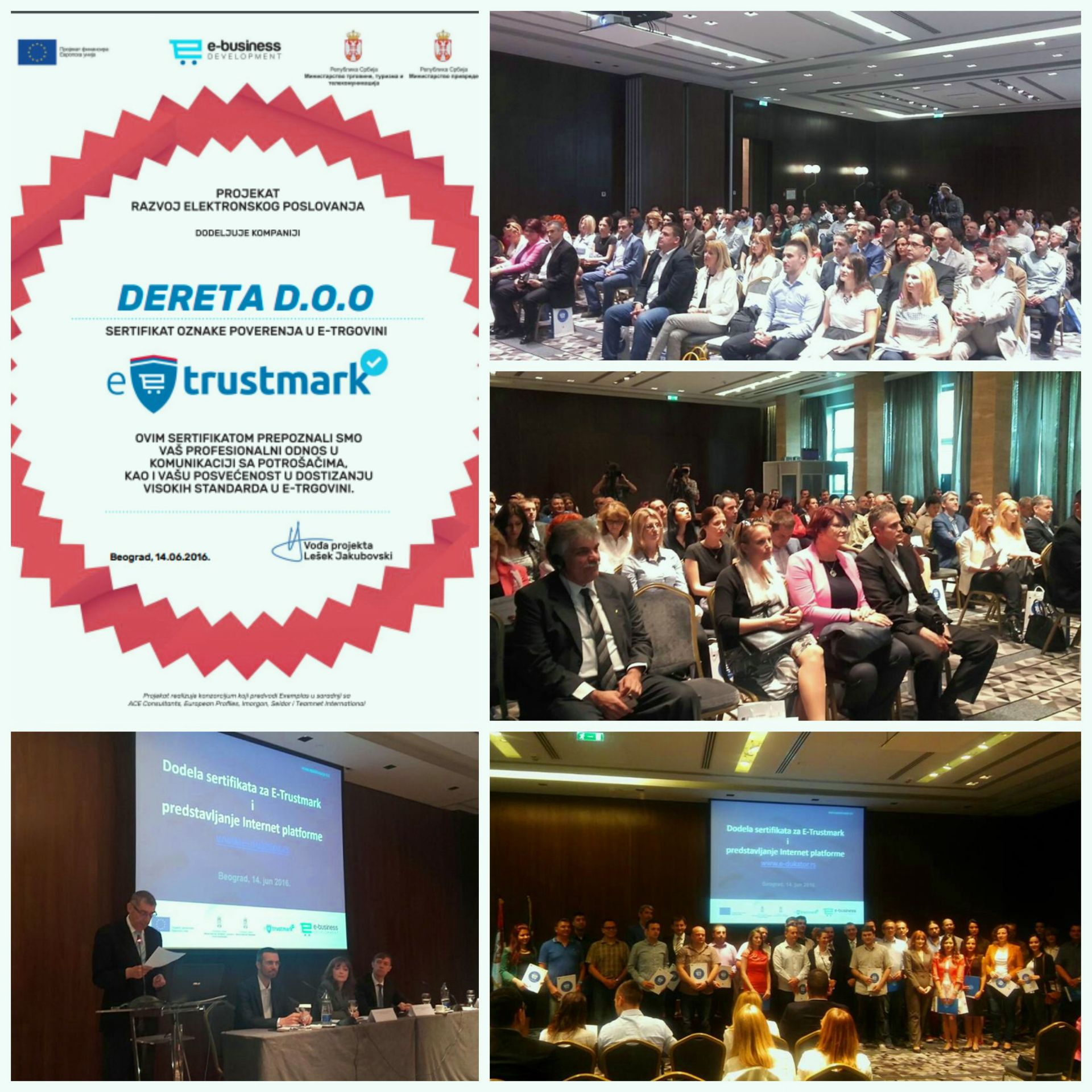 Izdavačka kuća Dereta je dobitnik sertifikata oznake poverenja u elektronskoj trgovini E-Trustmark koji se dodelje malim i srednjim preduzećima i preduzetnicima koji su dostigli visoke standarde u elektronskoj trgovini za dobijanje oznake poverenja.