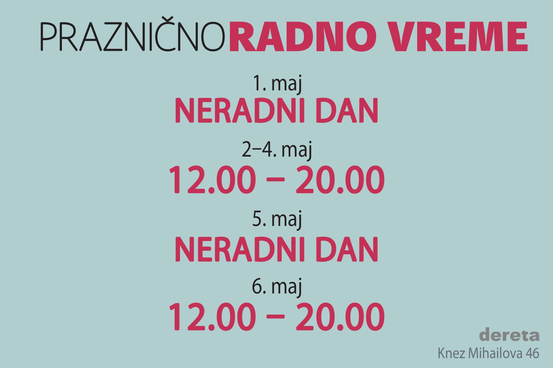 Praznično radno vreme knjižare Dereta