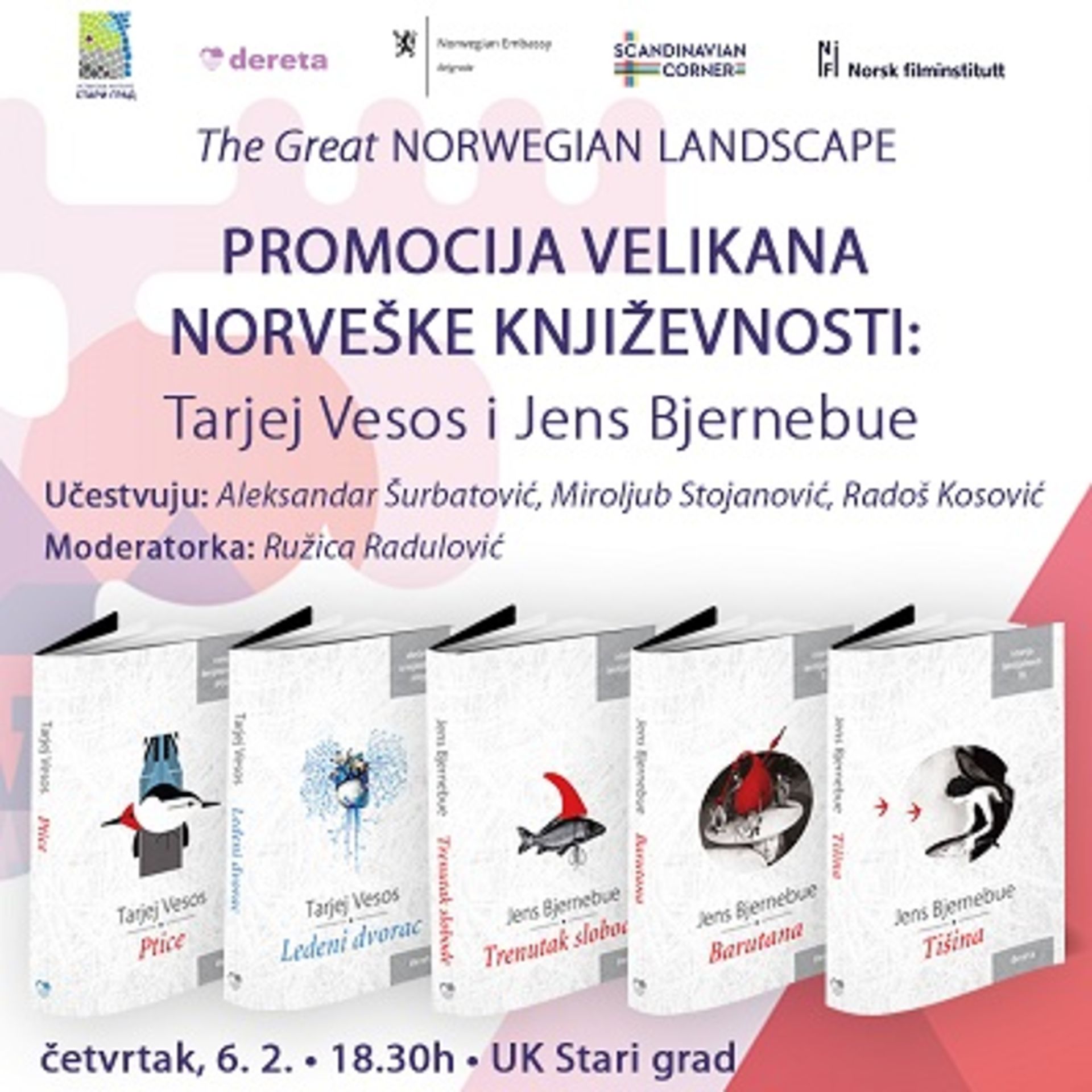 Četvrtog dana manifestacije „The Great Norwegian Landscape“, u organizaciji Skandinavskog kutka i izdavačke kuće Dereta, a uz podršku ambasade Kraljevine Norveške u Beogradu, publika će imati priliku da čuje više o delima velikana norveške posleratne književnosti, Tarjeju Vesosu i Jensu Bjernebueu. Književno veče i zvanično otvaranje manifestacije počinje u 18:30 u UK Stari grad, Kapetan Mišina 6a.