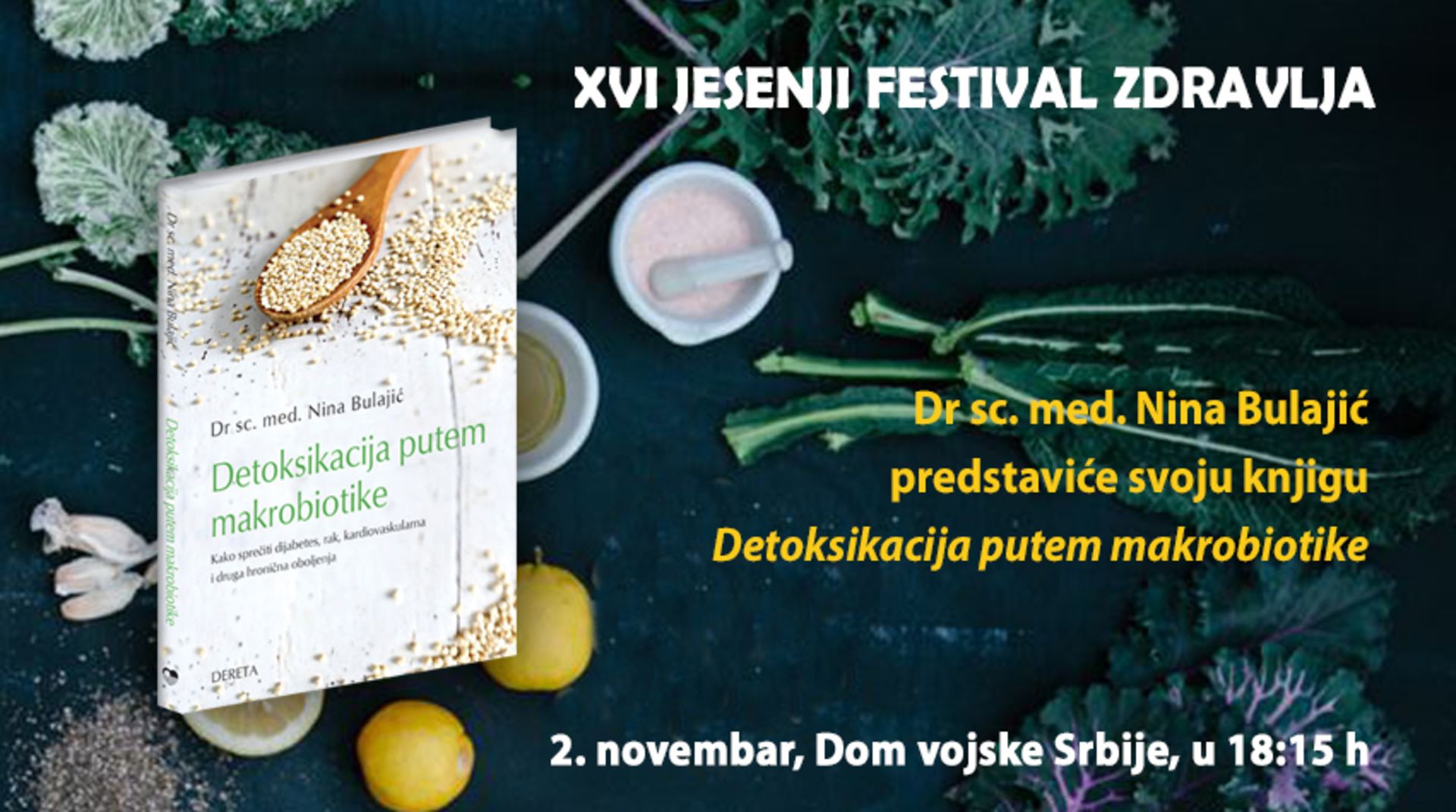 Dr sci. med. Nina Bulajic održaće predavanje i predstaviti svoju knjigu „Detoksikacija putem makrobiotike“ na Beogradskom festivalu zdravlja u Domu vojske, u četvrtak, 2. novembra, u 18:15 h.