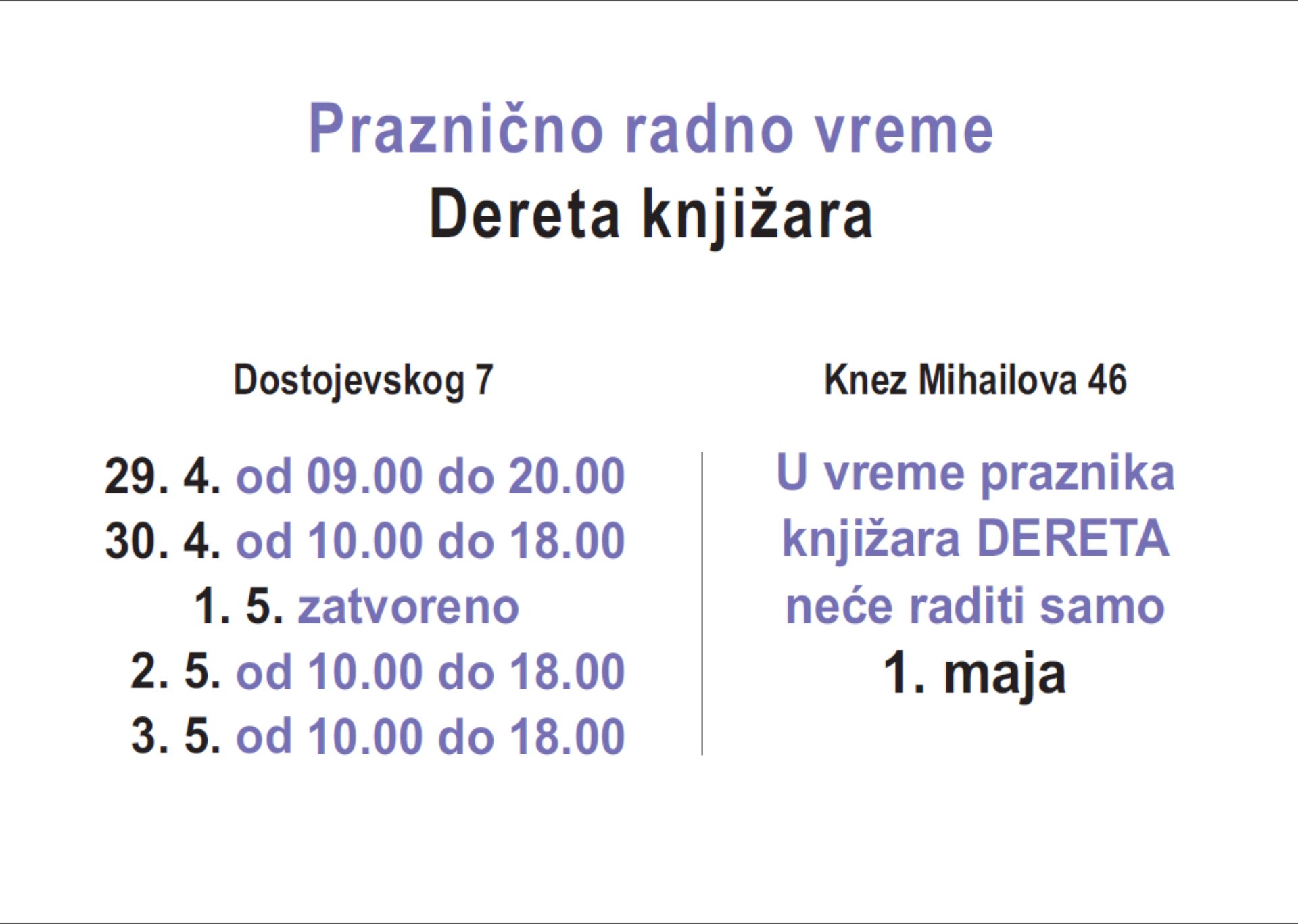 Praznično radno vreme Dereta knjižara