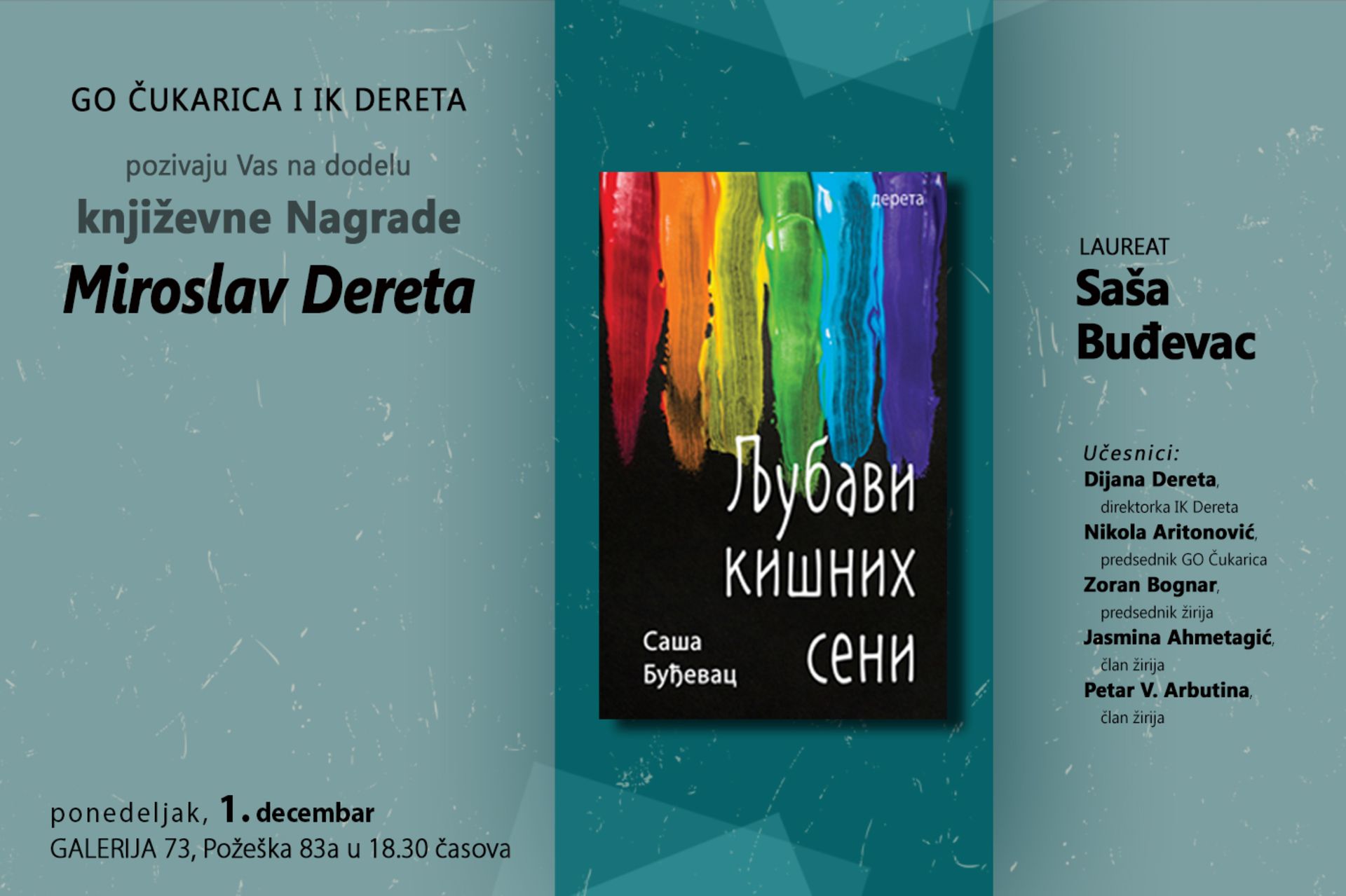 Nagradu će uručiti Nikola Aritonović, predsednik GO Čukarica i Dijana Dereta, direktor IK Dereta, a o knjizi će govoriti članovi žirija Zoran Bognar, Petar V. Arbutina i Jasmina Ahmetagić.