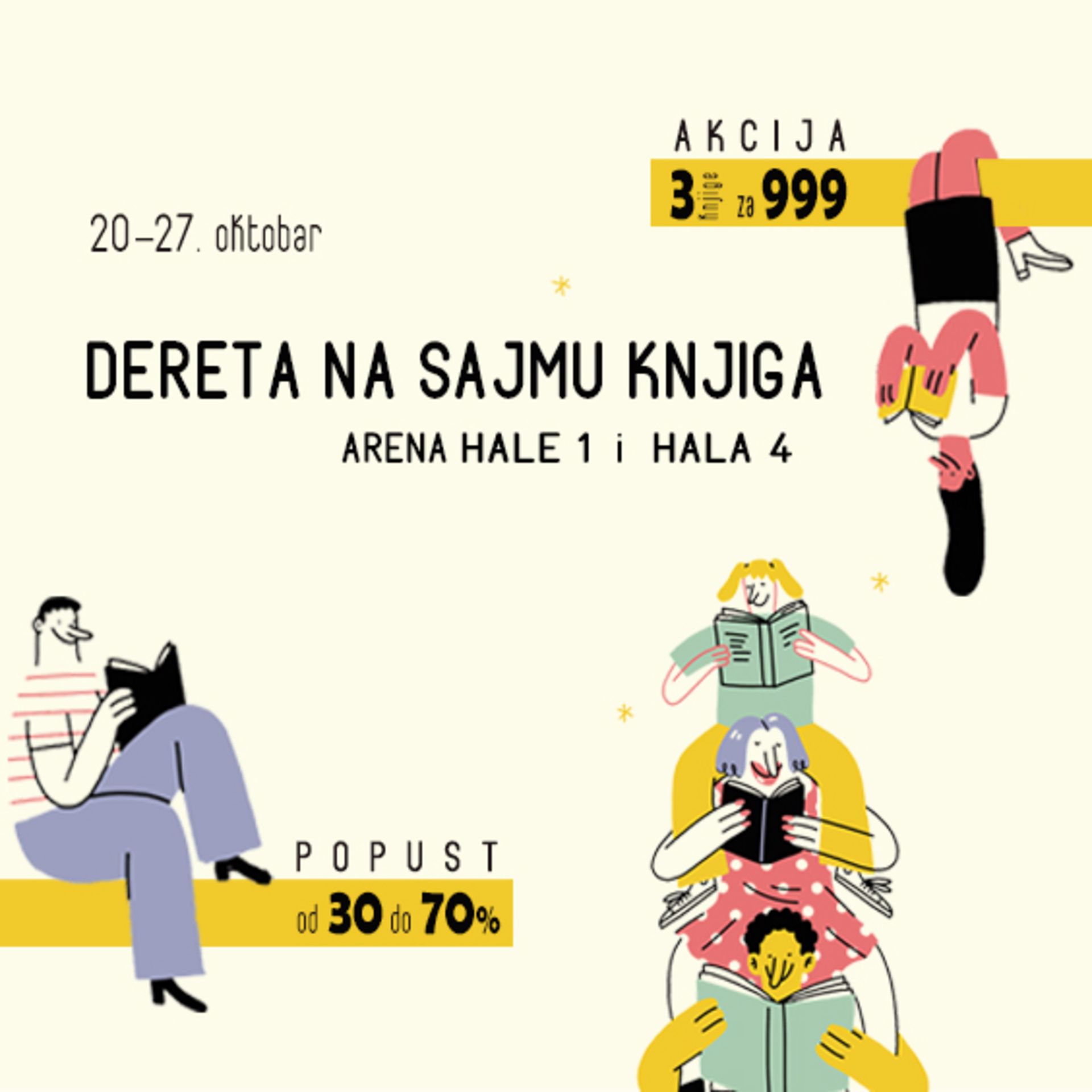 Na našim štandovima očekuju vas popusti od 30 do 70 %, akcija 3 knjige za 999 RSD i još mnogo toga.