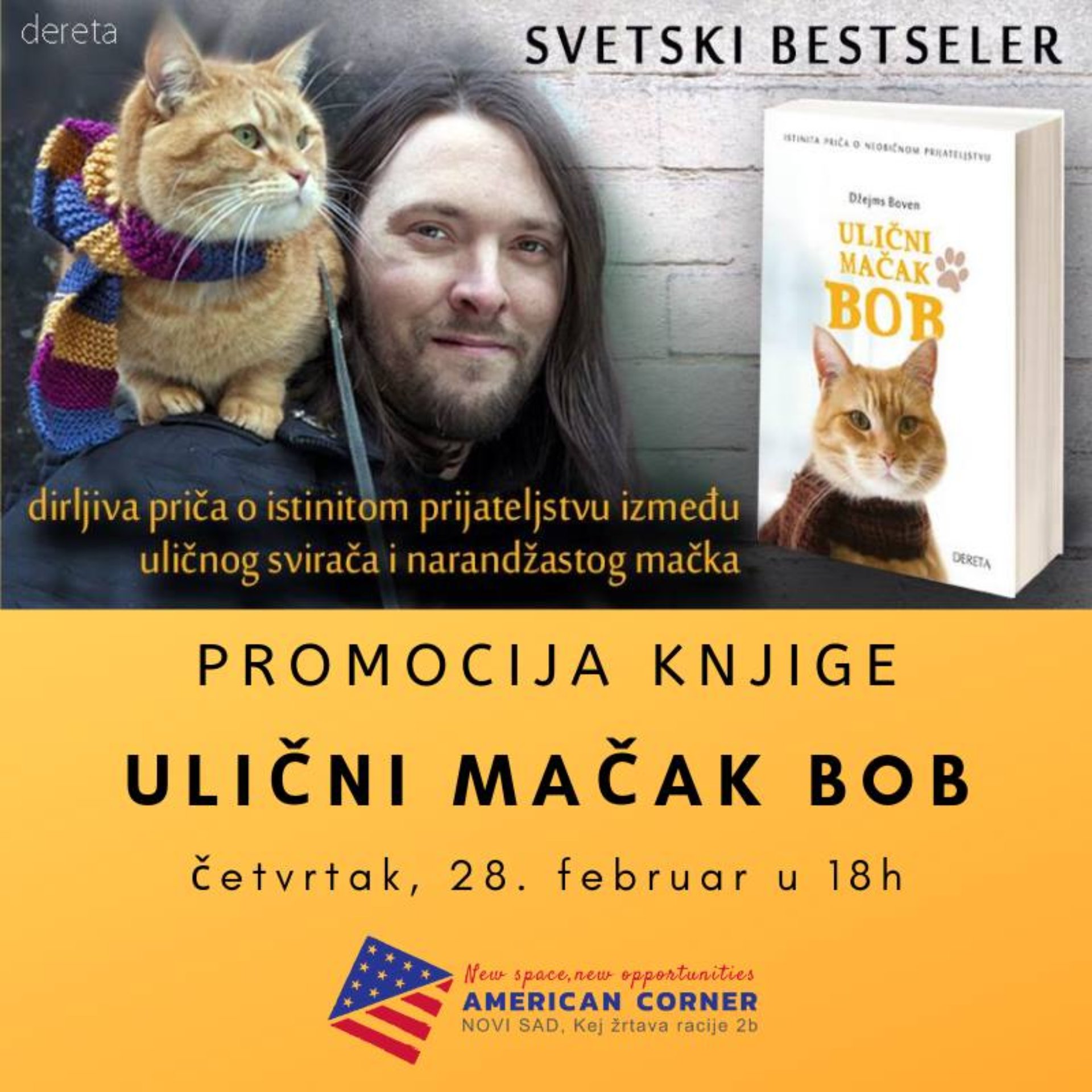 Izdavačka kuća Dereta i Američki kutak Novi Sad pozivaju vas na predstavljanje knjige Ulični mačak Bob Džejmsa Bovena.