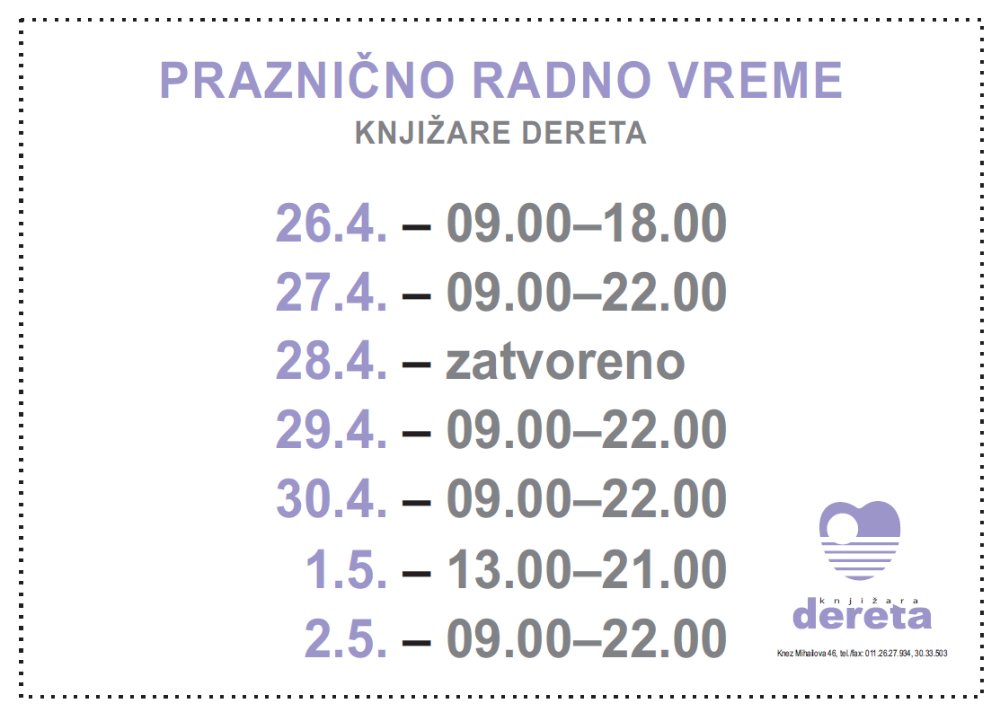 Posetite nas u Knez Mihailovoj 46. Samo na Uskrs ne radimo. Svim ostalim danima otvoreni smo za vas.