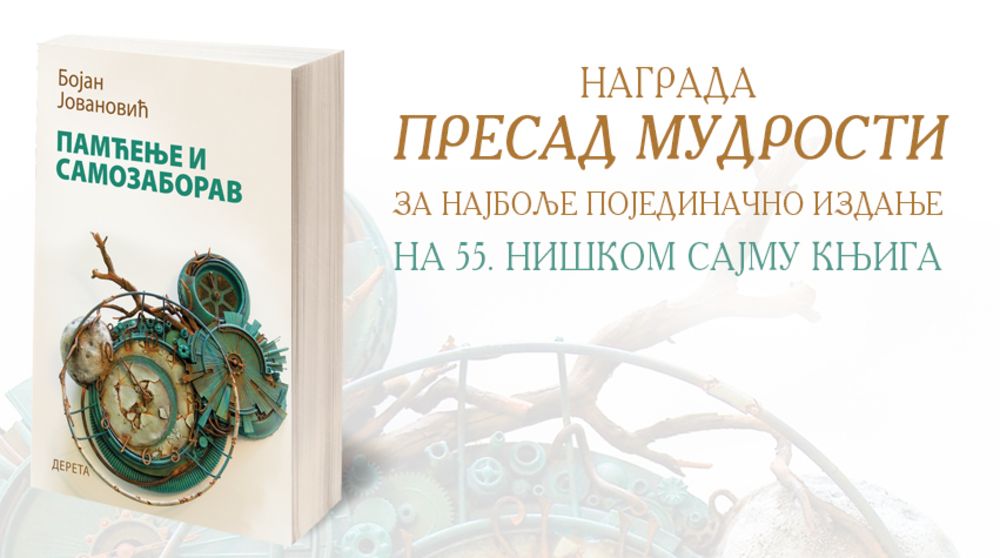 S ponosom vas obaveštavamo da je naša knjiga „Pamćenje i samozaborav“ autora Bojana Jovanovića dobila Nagradu „Presad mudrosti“ za najbolje pojedinačno izdanje na 55. Niškom sajmu knjiga.