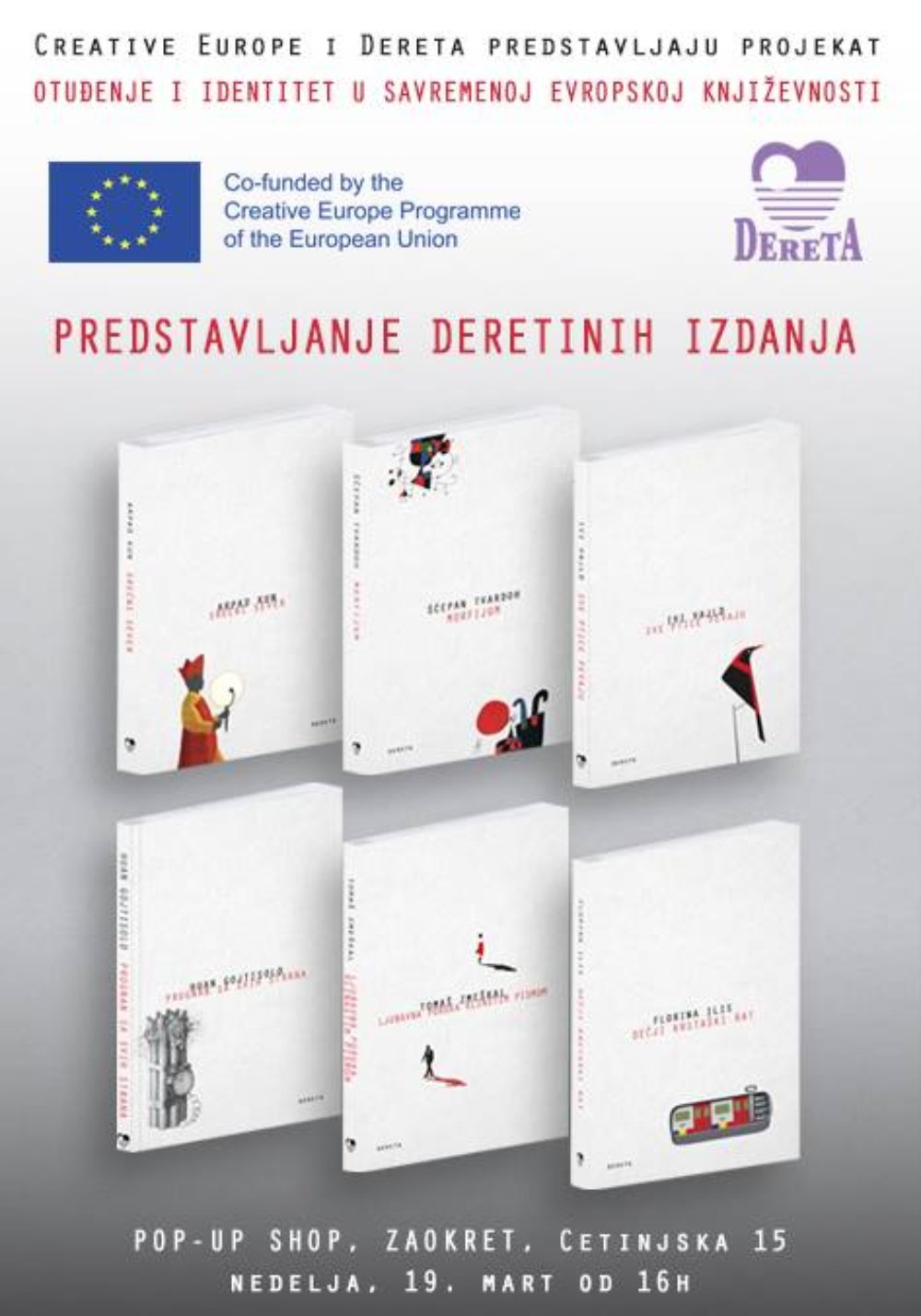 ►19. mart ► od 16h Pop-up shop ►Zaokret ► Predstavljanje Deretinih izdanja objavljenih u okviru projekta Otuđenje i identitet u savremenoj evropskoj književnosti, natalog u saradnji sa „Kreativnom Evropom“, sa posebnim osvrtom na delo Dečji krsta ...