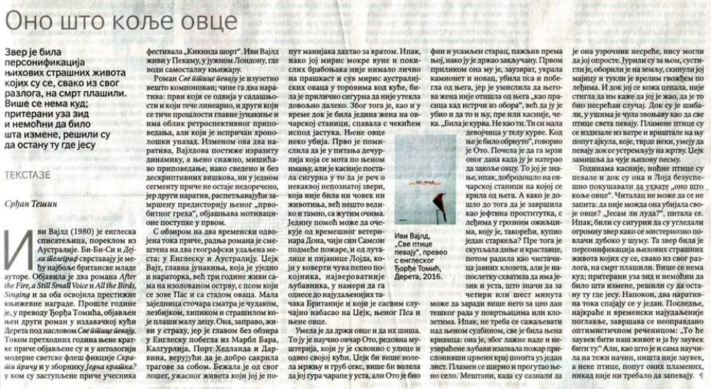 Prikaz romana „Sve ptice pevaju” u „Kulturnom dodatku” Politike