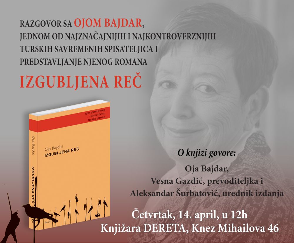 U četvrtak, 14. aprila, u našoj knjižari u Knez Mihailovoj 46, razgovarali smo sa Ojom Bajdar, jednom od najznačajnijih i najkontroverznijih turskih savremenih spisateljica. Ovom priliko predstavljen je njen roman „Izgubljena rečˮ.