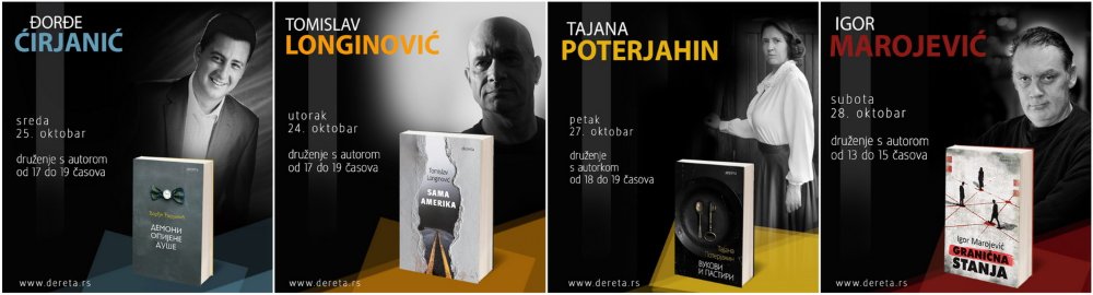 Tomislav Longinović, 24. oktobar, utorak, od 17 do 19h Đorđe Ćirjanić, 25. oktobar, sreda, od 17 do 19h Tajana Poterjahin, 27. oktobar, petak, od 18 do 19h Igor Marojević, 28. oktobar, subota, od 13 do 15h