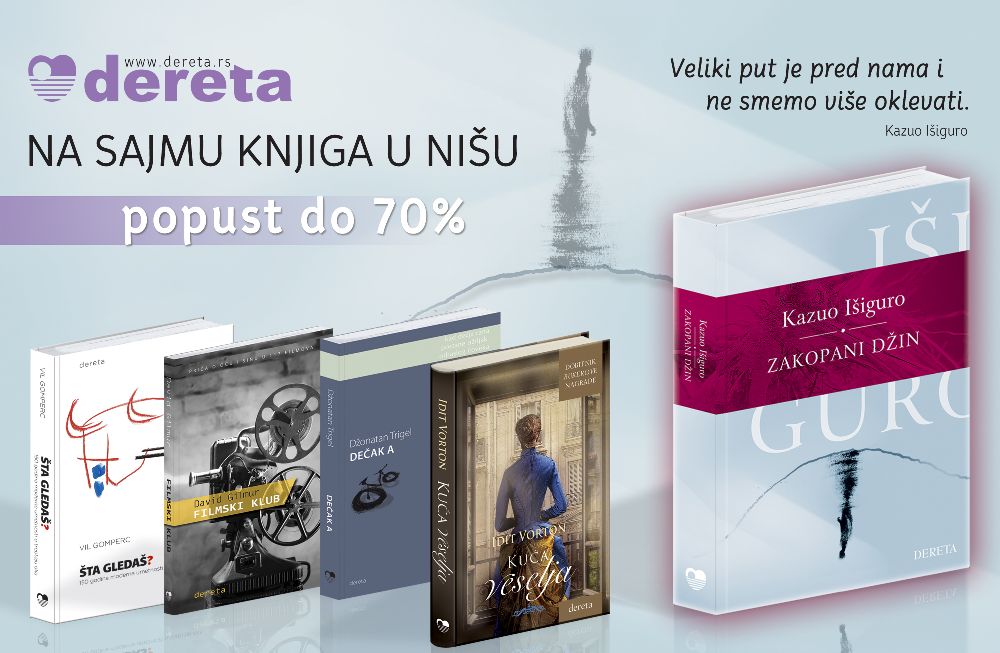 Popusti na sva Deretina izdanja do 13. januara. 25% za 2 kupljene knjige, 30% za 3 knjige, 40% za 4 knjige, dok je popust na kupovinu 5 i više knjiga 50%.